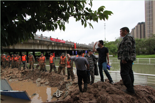 近日,特大暴雨連襲江城武漢,多地出現嚴重漬水。7月2日下午15時許,漢陽四新大道橫穿江城大道地下通道明渠發生緊急汛情,該處明渠水勢上漲迅猛,即將漫過堤壩進入車流量密集的交通要道四新大道,情況十分危急。由武漢天創市政建設工程有限公司承建的武漢新區江城大道改造工程施工第一標段項目部在現場巡查過程中發現此情況后,第一時間將汛情報告至公司總經理,同時項目經理劉吉祥、陶忠海立即組織20余名民工攜帶鐵鍬、編織袋趕至現場,并調配一臺挖掘機和四臺農用車迅速展開搶險工作。