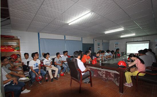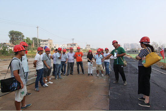 培訓過程中,快活嶺路項目技術負責人首先帶領大家參觀了混凝土路面的施工現場,詳細介紹了混凝土路面的施工流程、工藝及設備的配置與作用;肖三秀、范濤對模板架設等相關知識進行了細致地講解。隨后,全體人員通過詳實的PPT課件系統地學習了混凝土路面的施工工序及精細化施工要點。
