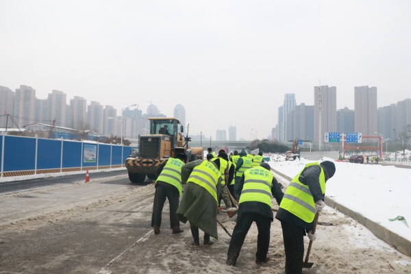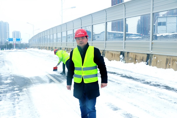 27日上午,來自向陽東路項(xiàng)目的施工員馮凌杰在參加完武漢市首屆職工春晚節(jié)目《幸福工程》情景劇的彩排后,第一時(shí)間趕到了除雪一線,全身心的投入到江城大道的除雪工作中。指揮作業(yè)、分導(dǎo)車流、引導(dǎo)機(jī)械,寒風(fēng)中,他額頭居然滲出汗來。“這條雙向六車道的路還有三公里的積雪要清除,早點(diǎn)清理完市民們出行就方便很多。”他說話的間隙路上駛過一輛公交車,乘客們臉上露出的欣喜和微笑大概就是給這支除雪隊(duì)伍最好的褒獎(jiǎng)。