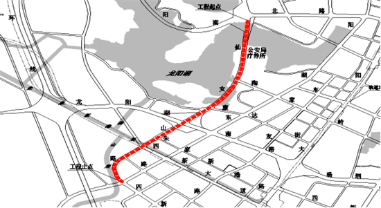 該工程位于武漢市二環、三環之間,全長約3026.226米,含有兩座跨龍陽湖高架,康達街至朱家新港路段為“高架+地面輔道”形式,其他路段為地面道路形式。漢陽市政天創公司負責實施的部分包括全長485.5米、以高架形式跨越龍陽湖的1號橋、Y/Z匝道以及長約185米的地面道路施工。
