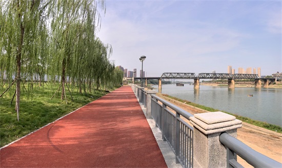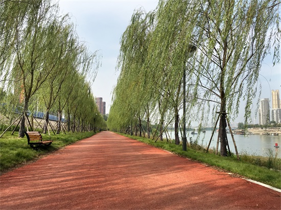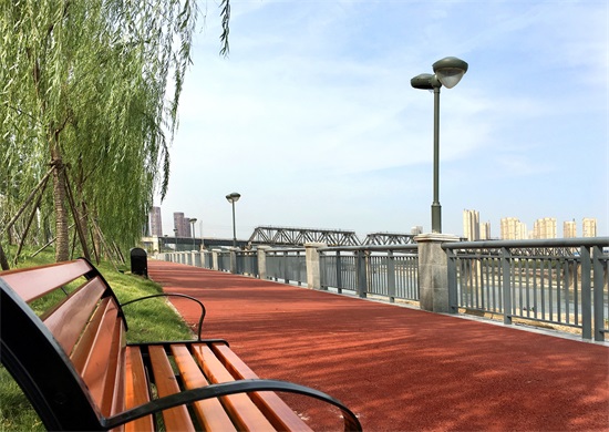該工程近4千米長的綠道均采用彩色瀝青混凝土進(jìn)行攤鋪,這種新型瀝青材料兼具良好的路用性能、消聲功能和柔韌性。在進(jìn)行瀝青攤鋪施工前,項(xiàng)目部積極邀請專家前往現(xiàn)場對瀝青拌合和試驗(yàn)段攤鋪進(jìn)行了指導(dǎo),統(tǒng)計(jì)出最佳技術(shù)指標(biāo)并形成了作業(yè)指導(dǎo)書,對瀝青攤鋪?zhàn)鳂I(yè)進(jìn)行了嚴(yán)格把控,并以此為切入點(diǎn)開展了QC研發(fā)工作,QC成果“提高彩色混凝土施工質(zhì)量”榮獲全國一等獎。