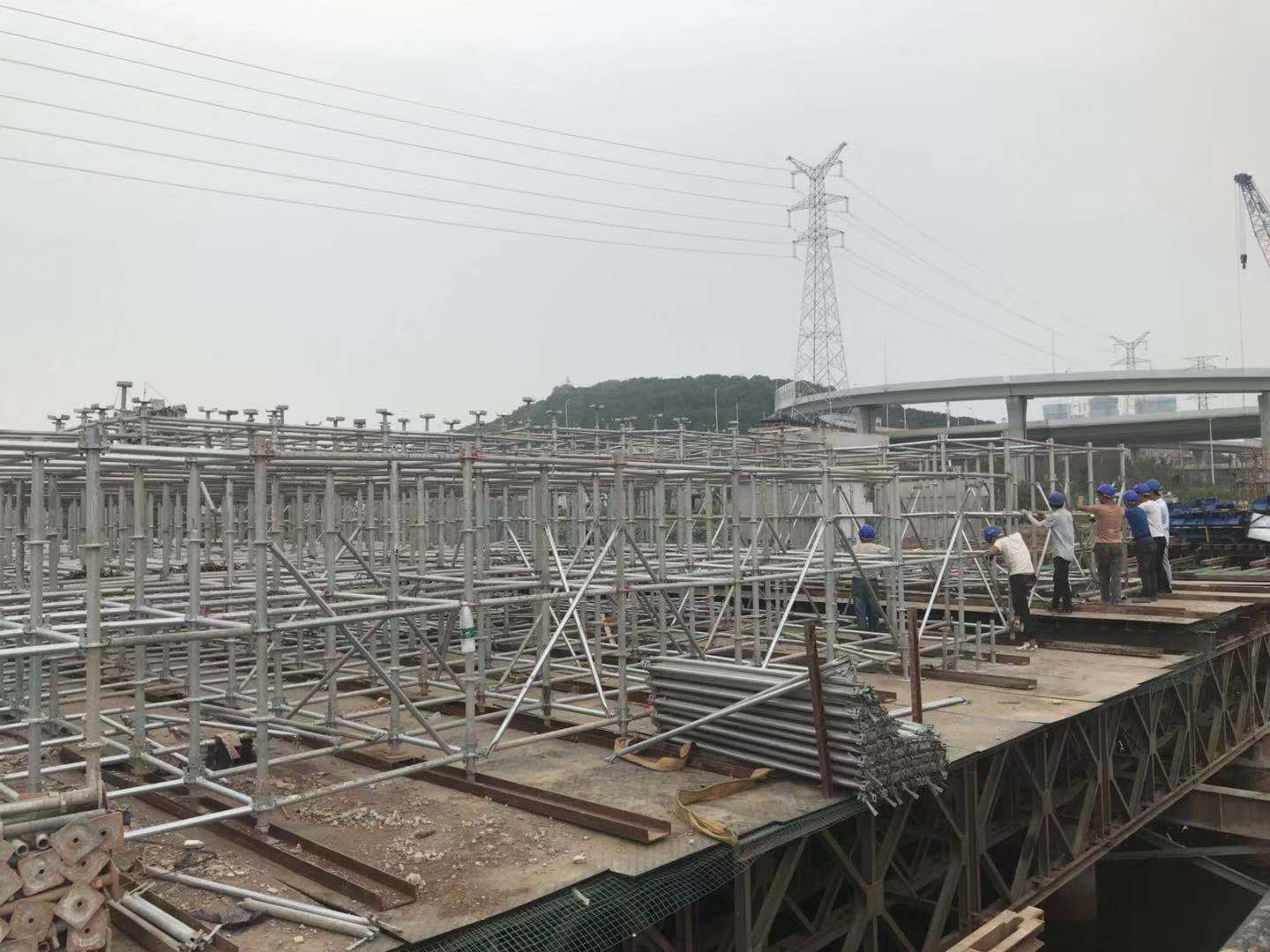 盤扣式支架具有內外熱鍍鋅工藝,承載力大、穩固性極高、無零散配件、省料省時便于管理等特點,整體架體集形象美觀、安全、高效于一體。盤扣支架功能齊全、應用廣泛、安全性能高、使用壽命長、作業空間大,在大型橋梁結構施工過程中,對高空作業人員的安全作業可起到雙保險的作用。