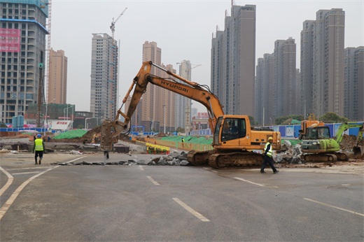 陶經理驅車帶我來到了工地的另一邊,雖然我沒有過這方面的學習經歷,但比照看過的稿件,這里應該正在進行路面破除和打樁,我問身邊的小哥:“雨天施工是不是很麻煩?”,“廢話!”他這樣一句簡短的回答讓我笑出聲來,“你看我們在地上都鋪了鋼板,挖掘機這種有履帶的車還好,輪胎到這兒就容易陷下去。”我的視線從遠處的打樁機一直移到自己的腳下,嚯,已經踩了一腳泥。“那邊溝怎么回事?水出不去就拿鍬疏通一下。”,轉頭回去的時候陶經理不忘囑咐施工人員,他手里的對講機里已經傳來催促的聲音。