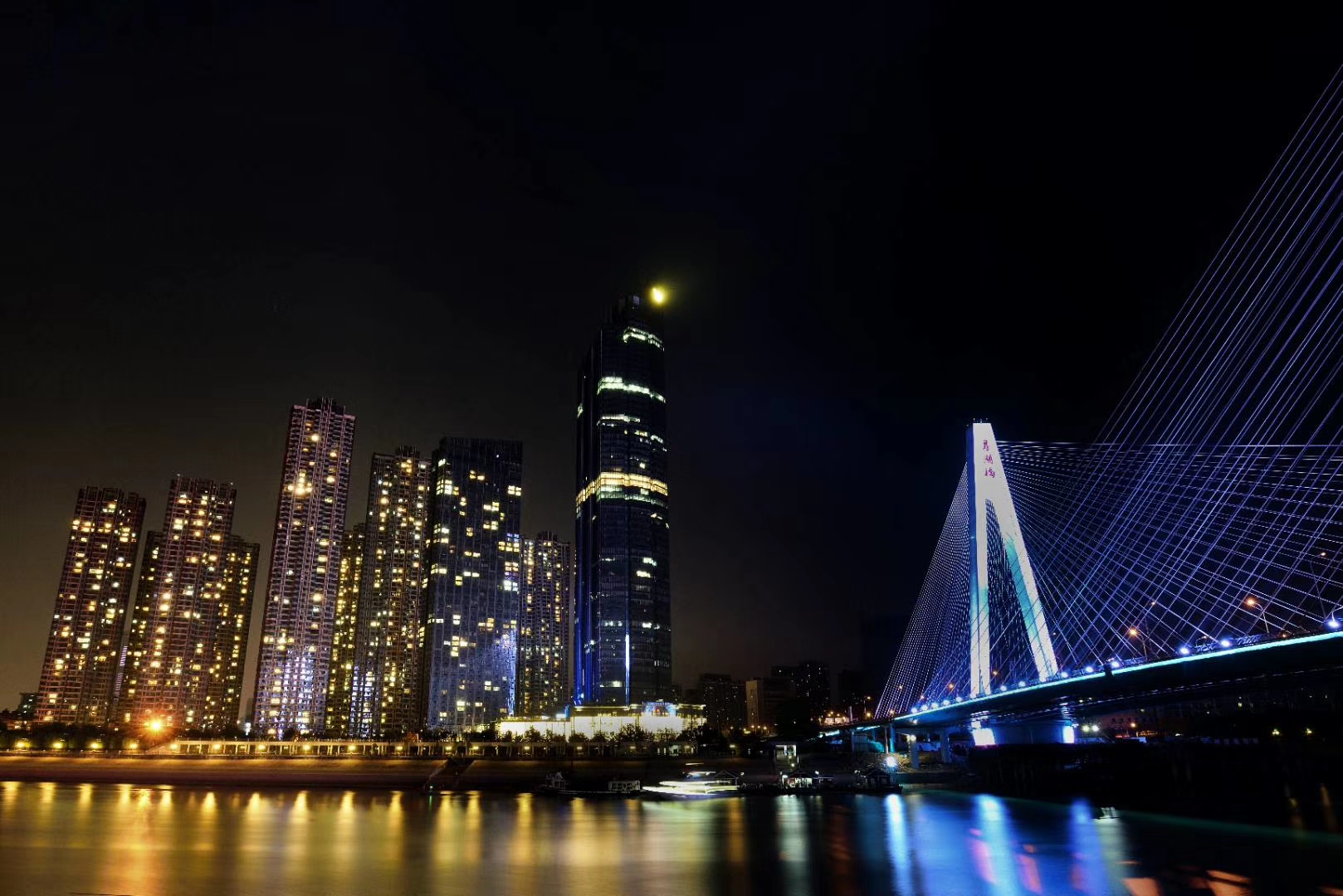 下班的時候車流高峰已經過去,穿過越秀廣場雀躍的燈光,慢慢走上月湖橋,水波流轉映襯著橋的挺拔和秀美,夜幕下的車尾燈走成了音符,如果有微風拂過,勝似仙樂飄飄,工作的忙碌喧囂便隨風兒飄向漢江。