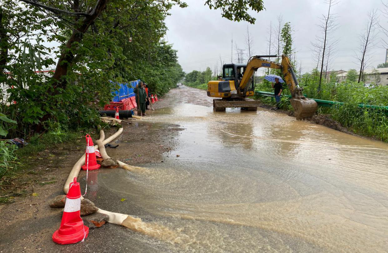 汛期到來,仙女山路項目部對工程開挖溝槽、道路排水情況進行排查。投入調水泵3臺,管理人員8名,對積水較深的溝槽、車道路面進行抽排,經過8小時抽排,終于恢復路面,車輛行人正常通行。