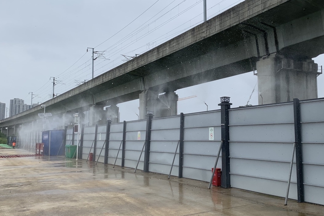進入施工區,項目封閉墻上,隨處可見安全文明標志牌和提示語。施工區自動噴淋降塵系統不時觸發,楊碧華饒有興趣地聽取了解。在浦興路施工場區,揚塵監控系統可以有效監測現場溫度、濕度、風速、PM10濃度和PM2.5濃度,“現場揚塵較大時,系統自動開啟運行,保證揚塵控制在合理范圍內。”現場項目負責人介紹到。