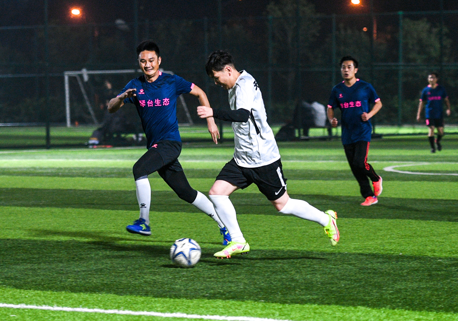 開場第1分鐘,天創隊中路發起攻擊,球分到13號曹元鑫董事長腳下,他不等足球停穩便一腳直塞,將球傳到8號劉泓康腳下,后者禁區前一腳勁射,被對手守門員抱住。精彩的配合贏得場下球迷一片喝彩聲。